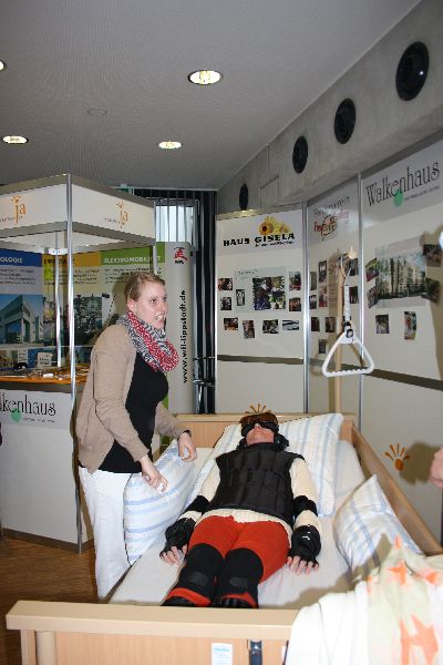 Die Möglichkeiten, einen Alterssimulationsanzug auszuprobieren, Einblicke in Lagerungstechniken am Pflegebett zu gewinnen oder die Fahrt mit einem Elektrorollstuhl auszuprobieren, stießen auf reges Interesse.